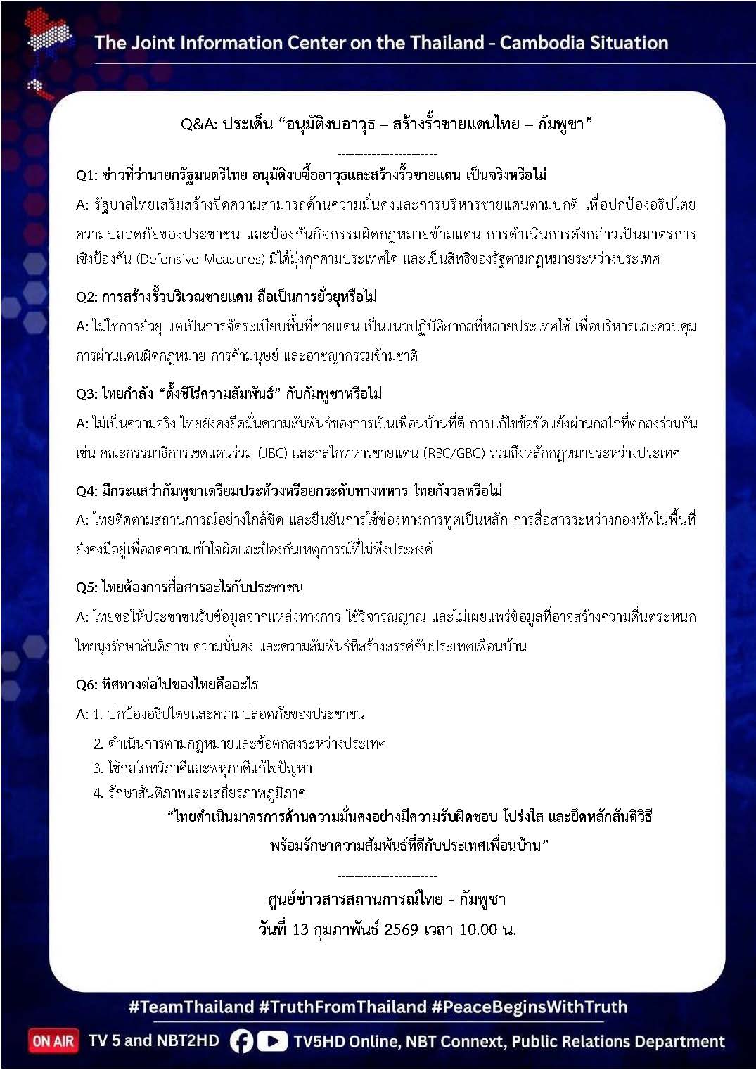 รักษ์ความสงบ ทั้งสองฝ่ายได้ย้ำถึง พันธกรณีของตนภายใต้อนุสัญญาว่าด้วยการห้ามใช้ สะสม ผลิต โอน และการทำลายทุ่นระเบิดสังหารบุคคล (Ottawa Convention) โดยทั้งสองฝ่ายจะปฏิบัติงานร่วมกันผ่านคณะทำงานประสานงานร่วม (Joint Coordinating Task Force: JCTF) ด้านการเก็บกู้ทุ่นระเบิดเพื่อมนุษยธรรม โดยเป็นไปตามมาตรฐานขั้นตอนการปฏิบัติ (Standard Operating Procedures: SOP) ำที่ได้ตกลงกัน เพื่อให้การเก็บกู้ทุ่นระเบิดตลอดแนวชายแดนมีความคืบหน้าโดยเร็ว ทั้งสองฝ่ายเห็นชอบร่วมกัน… 9 กุมภาพันธ์ 2026