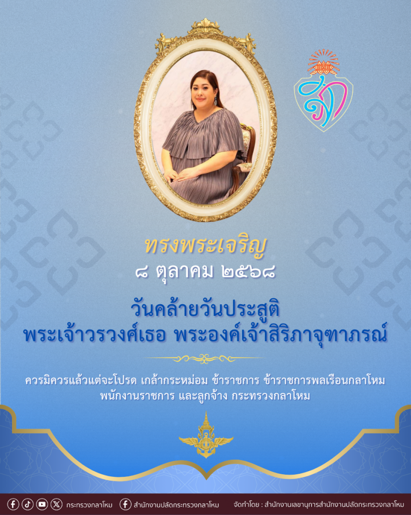 08 ต.ค. 00 ๘ ตุลาคม ๒๕๖๘ วันคล้ายวันประสูติ พระเจ้าวรวงศ์เธอ พระองค์เจ้าสิริภาจุฑาภรณ์ 8 ตุลาคม 2025หลักเมืองออนไลน์รักษ์กษัตริย์ #กระทรวงกลาโหม #สำนักงานปลัดกระทรวงกลาโหม #กองทัพไทย #กองทัพบก #กองทัพเรือ #กองทัพอากาศ