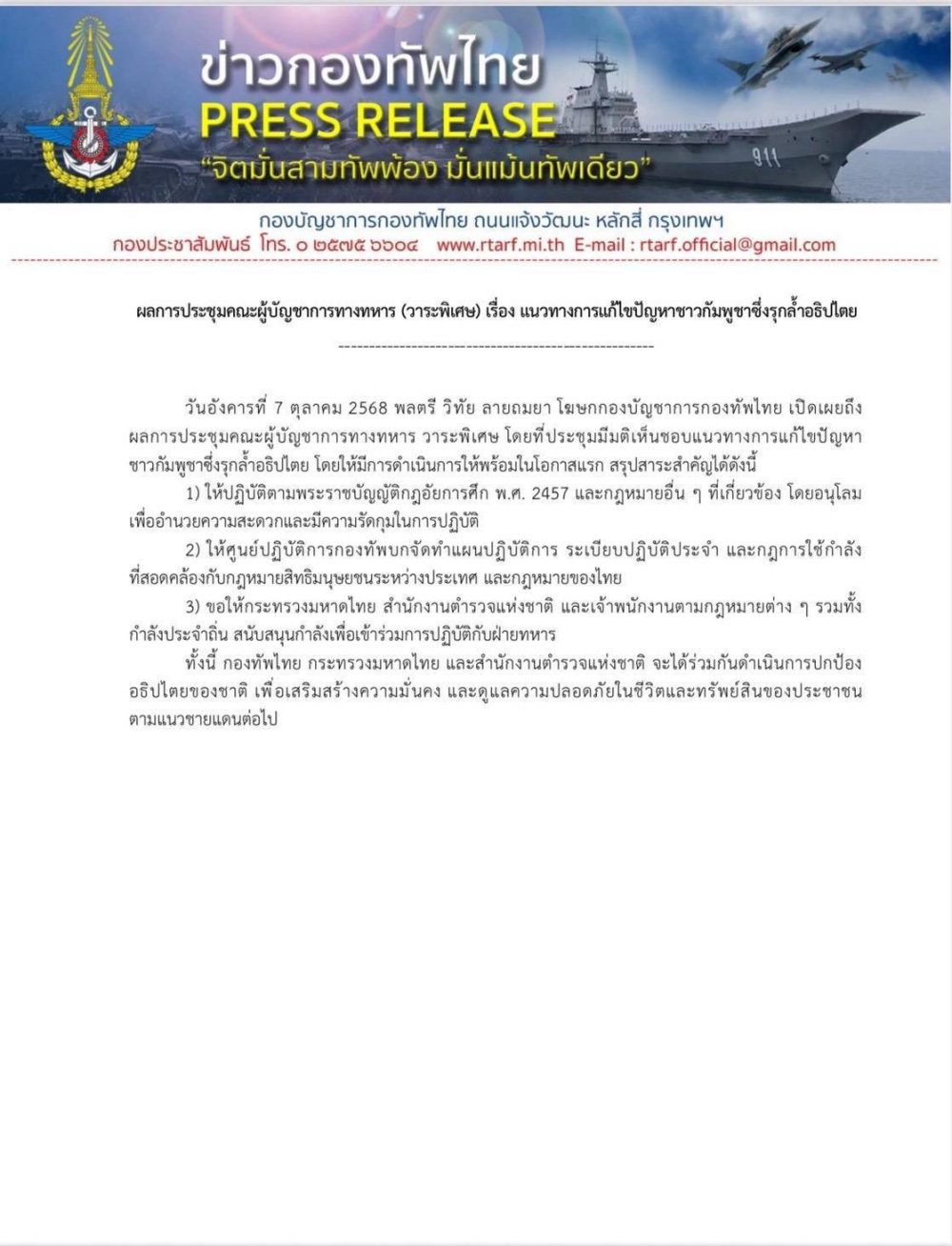 ทั้งนี้ กองทัพไทย กระทรวงมหาดไทย และสำนักงานตำรวจแห่งชาติ จะได้ร่วมกันดำเนินการปกป้องอธิปไตยของชาติ เพื่อเสริมสร้างความมั่นคงและดูแลความปลอดภัยในชีวิตและทรัพย์สินของประชาชนตามแนวชายแดนต่อไป