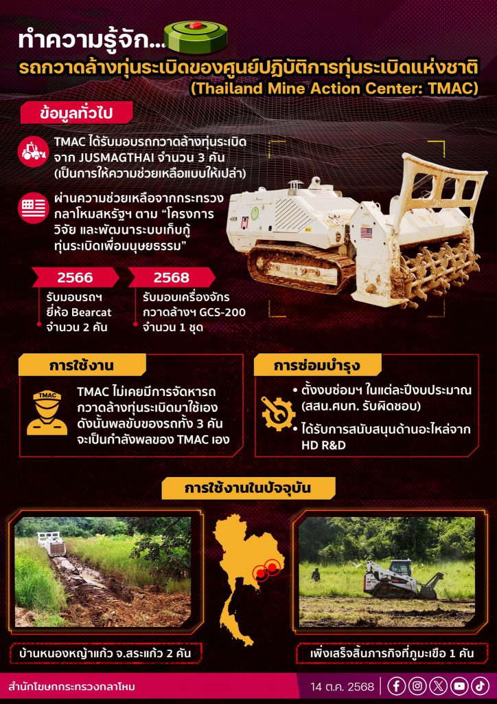 TMAC ได้รับมอบรถกวาดล้างทุ่นระเบิดจาก JUSMAGTHAI จำนวน 3 คัน (เป็นการให้ความช่วยเหลือแบบให้เปล่า) ผ่านความช่วยเหลือจาก กห.สหรัฐฯ ตาม “โครงการวิจัยและพัฒนาระบบเก็บกู้ทุ่นระเบิดเพื่อมนุษยธรรม (Humanitarian Demining Research and Development Program: HD R&D)” ประกอบด้วย