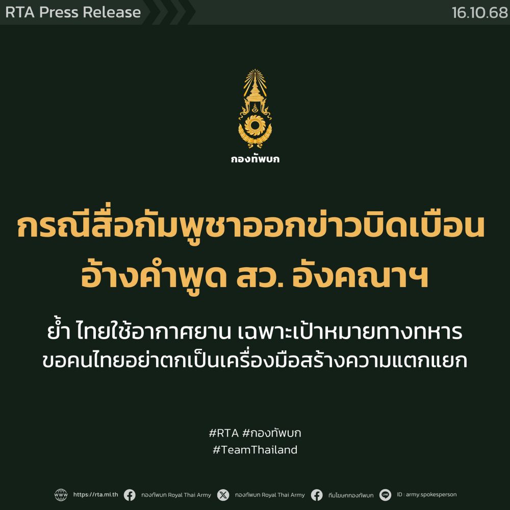 16 ต.ค. 00 กองทัพบกแจงกรณีข่าวบิดเบือนสื่อกัมพูชา อ้างคำพูด สว. อังคณา ผิดจากข้อเท็จจริง ย้ำอย่าตกเป็นเครื่องมือสร้างความแตกแยก 16 ตุลาคม 2025หลักเมืองออนไลน์หลักเมืองสัมพันธ์ ที่มา : แฟนเพจ กองทัพบก
