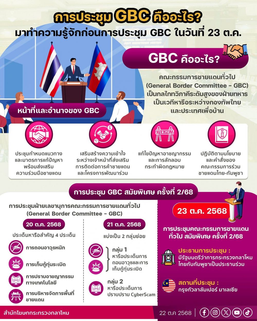 ทั้งนี้ การประชุมฝ่ายเลขาฯ จัดขึ้นระหว่าง 20-22 ตุลาคม 2568 เพื่อจัดเตรียมข้อมูลสำหรับการประชุม GBC ในวันที่ 23 ตุลาคม 2568 ณ Malaysian Armed Forces Officers Mess กรุงกัวลาลัมเปอร์ มาเลเซีย โดยมี รัฐมนตรีว่าการกระทรวงกลาโหม และรัฐมนตรีว่าการกระทรวงกลาโหม กัมพูชา เป็นประธานร่วม