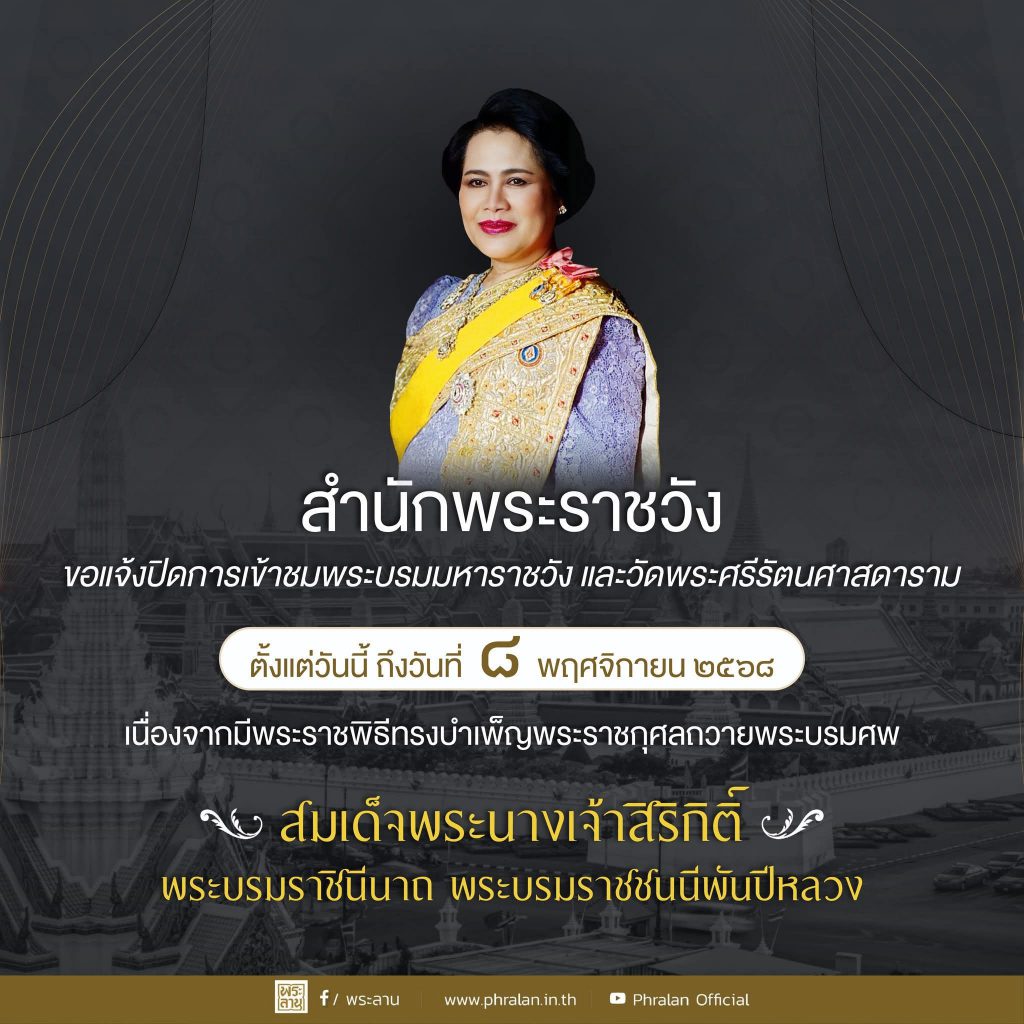 ตั้งแต่วันนี้ ถึงวันที่ ๘ พฤศจิกายน ๒๕๖๘ เนื่องจากมีพระราชพิธีทรงบำเพ็ญพระราชกุศลถวายพระบรมศพ สมเด็จพระนางเจ้าสิริกิติ์ พระบรมราชินีนาถ พระบรมราชชนนีพันปีหลวง