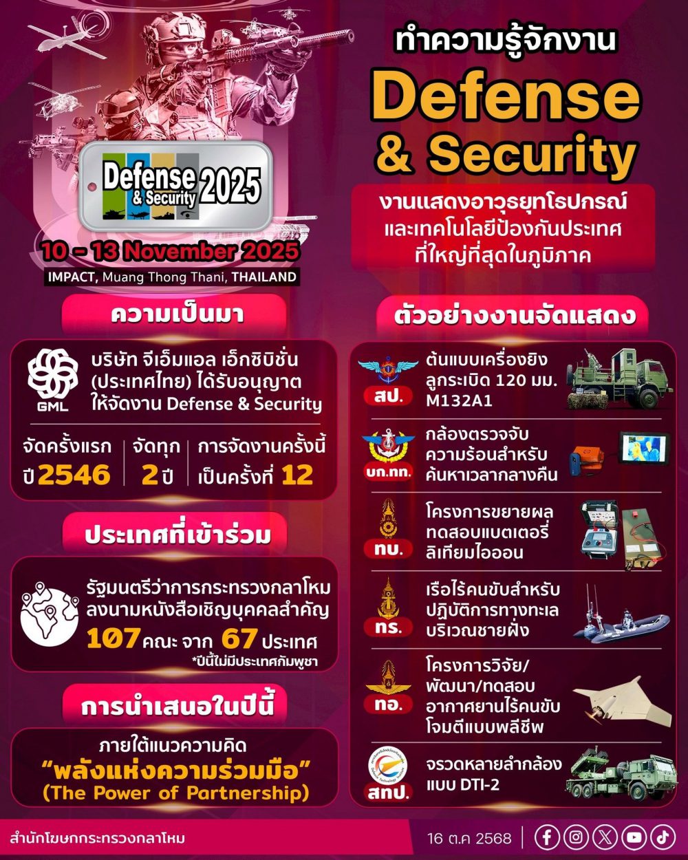 ทั้งนี้ ภายในงานยังมีการจัดสัมมนาและการนำเสนอทางเทคนิคในประเด็นสำคัญเกี่ยวกับแนวโน้มภัยคุกคามและเทคโนโลยีการสงครามในอนาคต พร้อมการสาธิตยุทโธปกรณ์จริงจากผู้ผลิตชั้นนำทั่วโลก