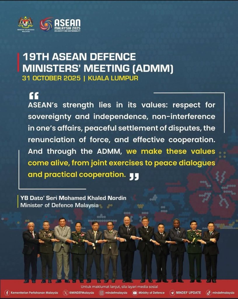 พลเรือตรี สุรสันต์ คงสิริ โฆษกกระทรวงกลาโหม เปิดเผยว่า เมื่อวันศุกร์ที่ 31 ตุลาคม 2568 พลเอก ณัฐพล นาคพาณิชย์ รัฐมนตรีว่าการกระทรวงกลาโหม ร่วมการประชุมรัฐมนตรีกลาโหมอาเซียน หรือ ADMM ครั้งที่ 19 ณ ประเทศมาเลเซีย ยืนหยัด ‘ASEAN Unity & Centrality’ ความเป็นอันหนึ่งอันเดียวกันและความเป็นแกนกลาง เพื่อความมั่นคงรุ่งเรือง โดยที่ประชุมได้ให้การรับรองเอกสารความร่วมมือริเริ่มใหม่ 8 ฉบับ รวมถึงแนวคิดว่าด้วยความมั่นคงปลอดภัยของโครงสร้างพื้นฐานใต้ทะเลที่ไทยร่วมเสนอ