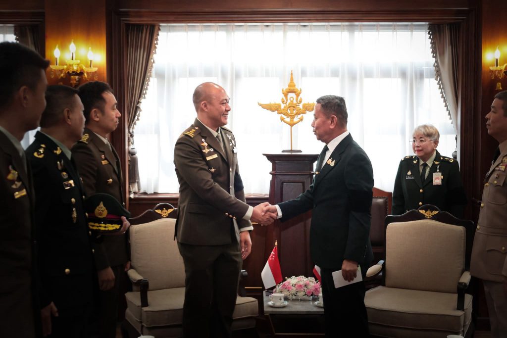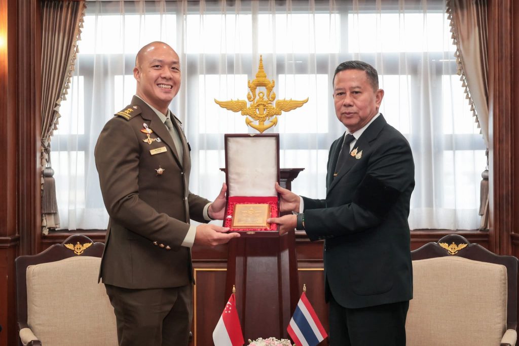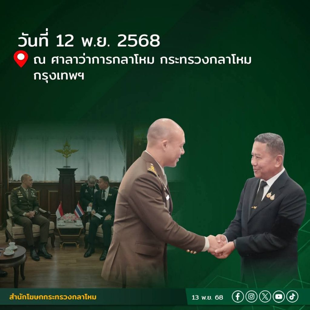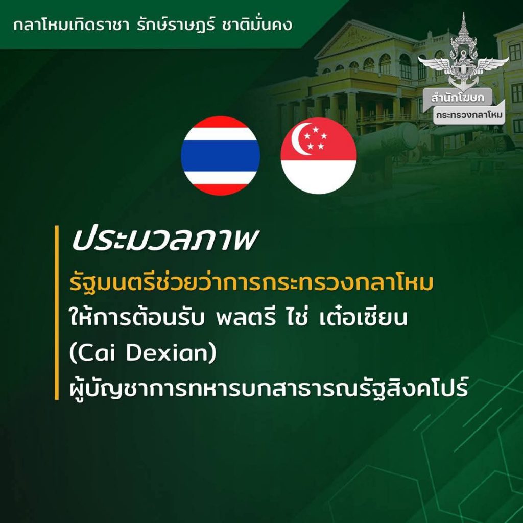 พลเรือตรี สุรสันต์ คงสิริ โฆษกกระทรวงกลาโหม เปิดเผยว่า เมื่อวันพุธที่ 12 พฤศจิกายน 2568 เวลา 10.30 นาฬิกา พลตรี ไช่ เต๋อเซียน (Cai Dexian) ผู้บัญชาการทหารบกสาธารณรัฐสิงคโปร์ และคณะ ได้เข้าเยี่ยมคำนับ พลโทอดุลย์ บุญธรรมเจริญ รัฐมนตรีช่วยว่าการกระทรวงกลาโหม ณ ศาลาว่าการกลาโหม ในโอกาสเดินทางเยือนประเทศไทยอย่างเป็นทางการ ในฐานะแขกของกองทัพบกระหว่างวันที่ 9 – 12 พฤศจิกายน 2568 เพื่อกระชับความสัมพันธ์และส่งเสริมความร่วมมือระหว่างกองทัพของทั้งสองประเทศ