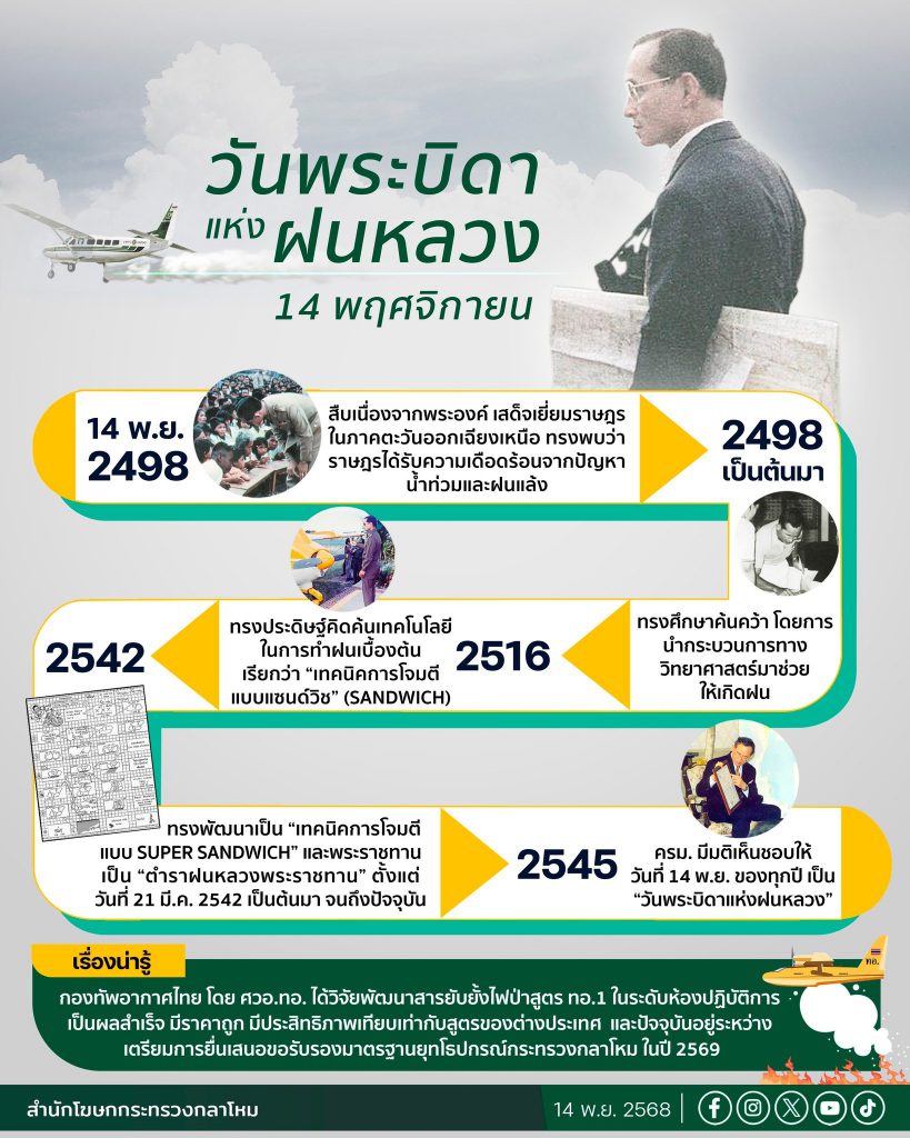 กระทรวงเกษตรและสหกรณ์ ในฐานะที่เป็นองค์กรที่ได้ดำเนินงานโครงการพระราชดำริฝนหลวงมาตั้งแต่เริ่มแรกโครงการได้เสนอให้วันที่ 14 พ.ย. ของทุกปี เป็น “วันพระบิดาแห่งฝนหลวง” ในการประชุมคณะรัฐมนตรีและคณะรัฐมนตรี ได้มีมติเห็นชอบเมื่อวันที่ 20 ก.ค. 2545