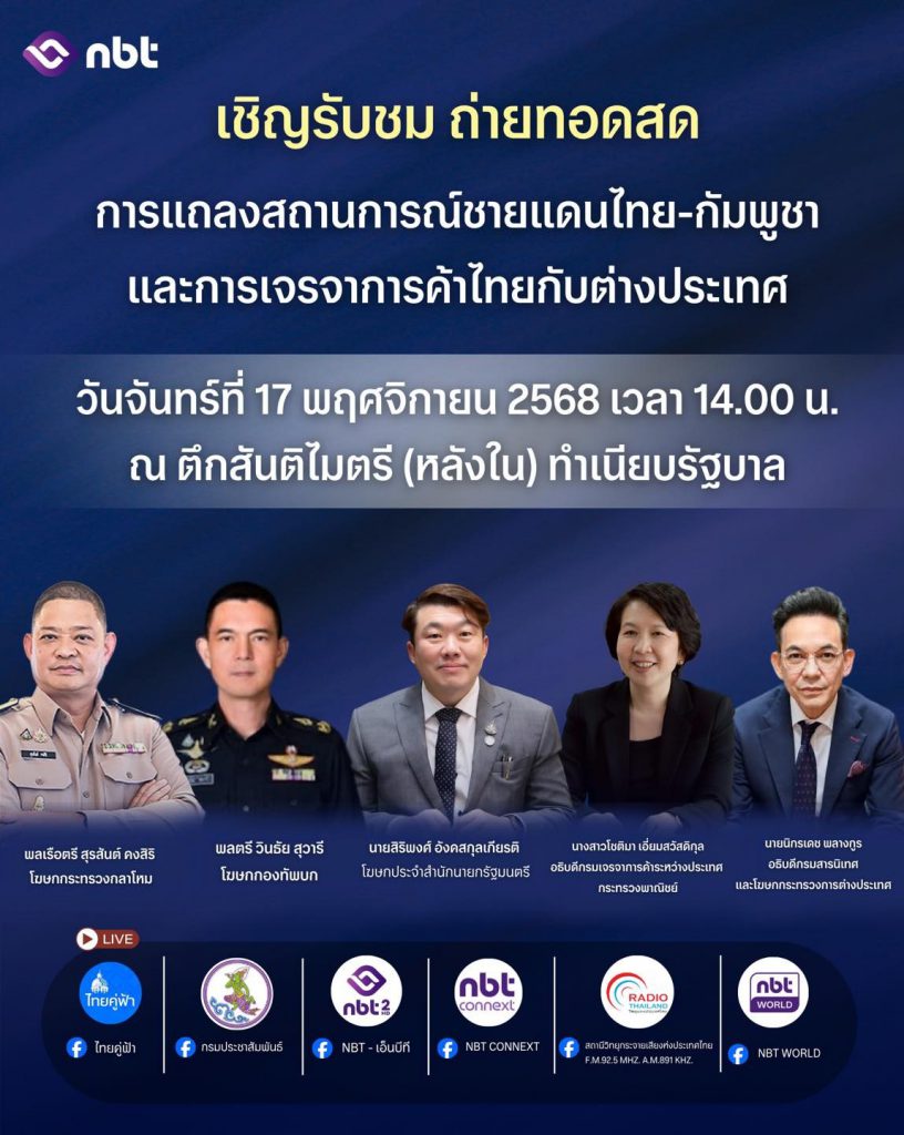 จันทร์ที่ 17 พฤศจิกายน 2568 เวลา 14.00 น. ณ ตึกสันติไมตรี (หลังใน) ทำเนียบรัฐบาล