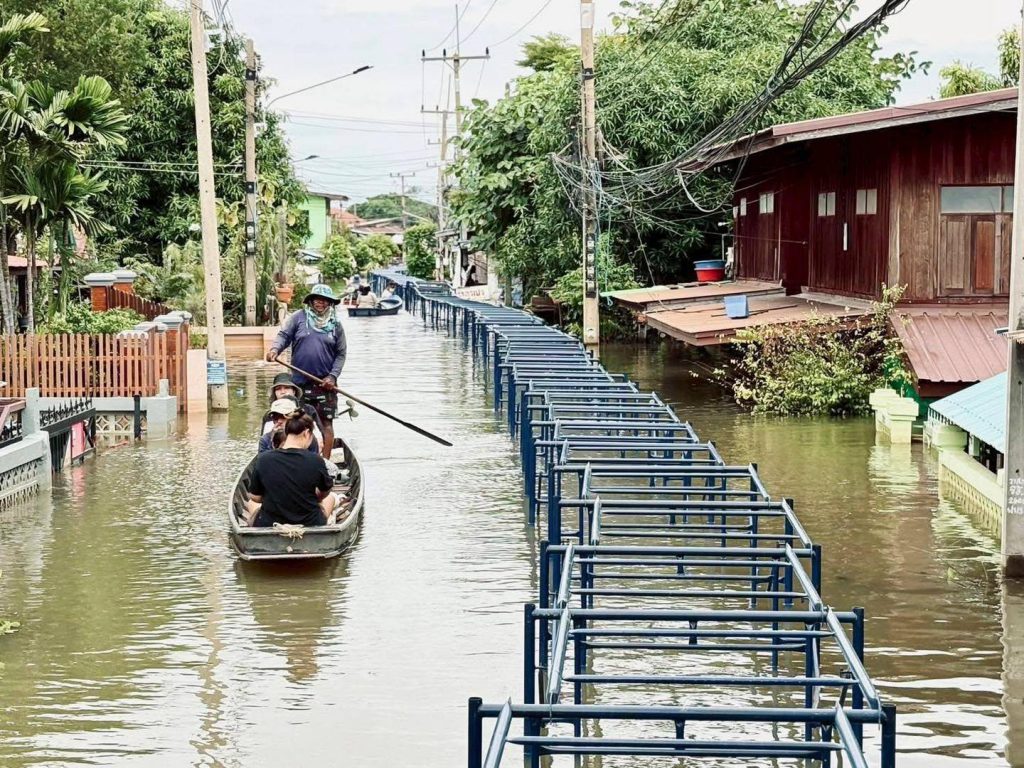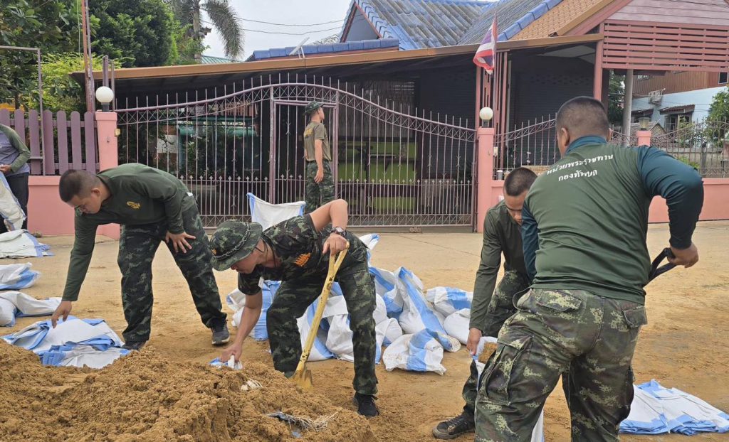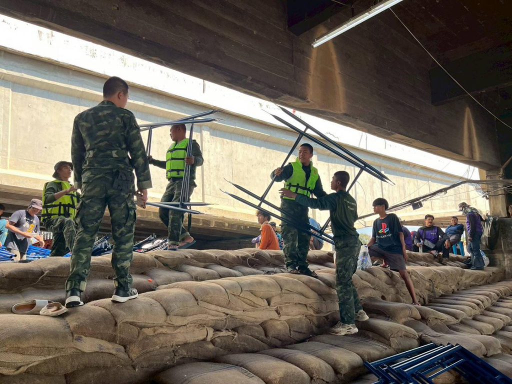 2. กรอกกระสอบทราย เพื่อทำแนวกั้นน้ำเพิ่มความสูง เสริมความแข็งแรง และเสริมจุดที่รั่วไหล