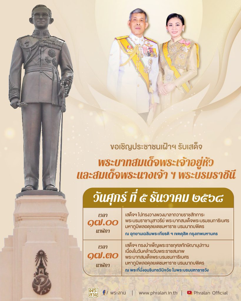 ณ อุทยานเฉลิมพระเกียรติ พระบาทสมเด็จพระบรมชนกาธิเบศร มหาภูมิพลอดุลยเดชมหาราช บรมนาถบพิตร และพระที่นั่งอมรินทรวินิจฉัย พระบรมมหาราชวัง วันศุกร์ที่ ๕ ธันวาคม ๒๕๖๘ เวลา ๑๗.๐๐ น. และ เวลา ๑๗.๓๐ น.