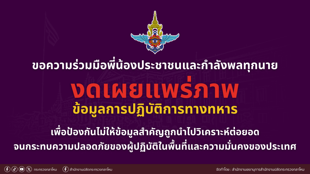 09 ธ.ค. 00 ขอความร่วมมือพี่น้องประชาชนและกำลังพลทุกนาย งดเผยแพร่ภาพข้อมูลการปฏิบัติการทางทหาร เพื่อป้องกันไม่ให้ข้อมูลสำคัญถูกนำไปวิเคราะห์ต่อยอยอดจนกระทบความปลอดภัยของผู้ปฏิบัติในพื้นที่และความมั่นคงของประเทศ 9 ธันวาคม 2025หลักเมืองออนไลน์หลักเมืองสัมพันธ์ #กระทรวงกลาโหม #สำนักงานปลัดกระทรวงกลาโหม #กองทัพไทย #กองบัญชาการกองทัพไทย #กองทัพบก #กองทัพเรือ #กองทัพอากาศ