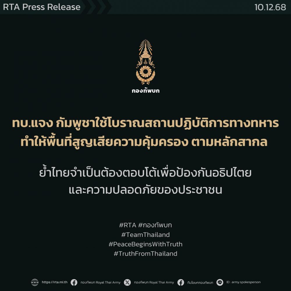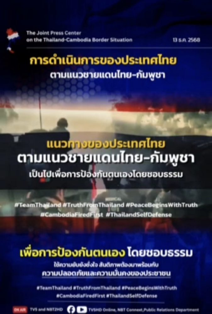13 ธ.ค. 00 การดำเนินการของประเทศไทย ตามแนวชายแดนไทย-กัมพูชา เพื่อการป้องกันตนเองโดยชอบธรรม 13 ธันวาคม 2025หลักเมืองออนไลน์รักษ์ความสงบ