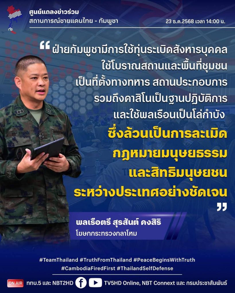 24 ธ.ค. 00 “ฝ่ายกัมพูชามีการใช้ทุ่นระเบิดสังหารบุคคล ใช้โบราณสถานและพื้นที่ชุมชนเป็นที่ตั้งทางทหาร สถานประกอบการรวมถึงคาสิโนเป็นฐานปฏิบัติการ และใช้พลเรือนเป็นโล่กำบัง ซึ่งล้วนเป็นการละเมิดกฎหมายมนุษยธรรมและสิทธิมนุษยชนระหว่างประเทศอย่างชัดเจน” 24 ธันวาคม 2025หลักเมืองออนไลน์รักษ์เอกราช พลเรือตรี สุรสันต์ คงสิริ โฆษกกระทรวงกลาโหม 23 ธ.ค.68
