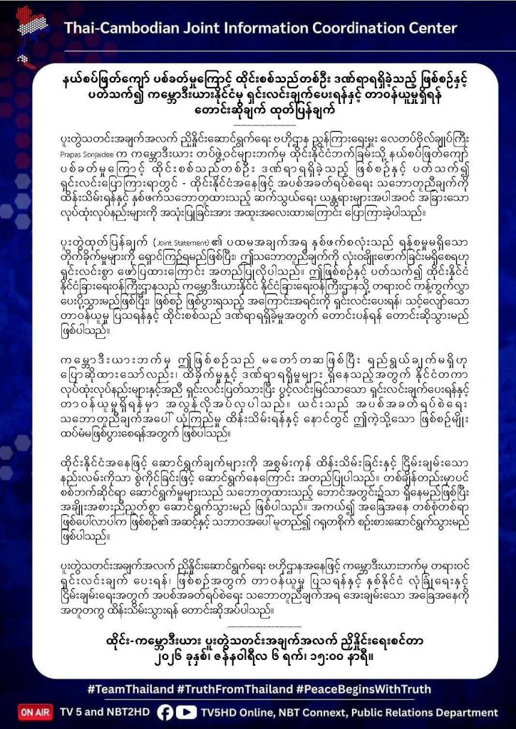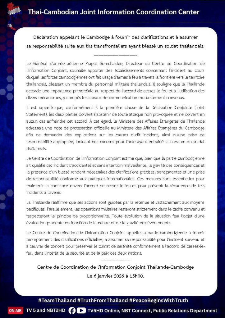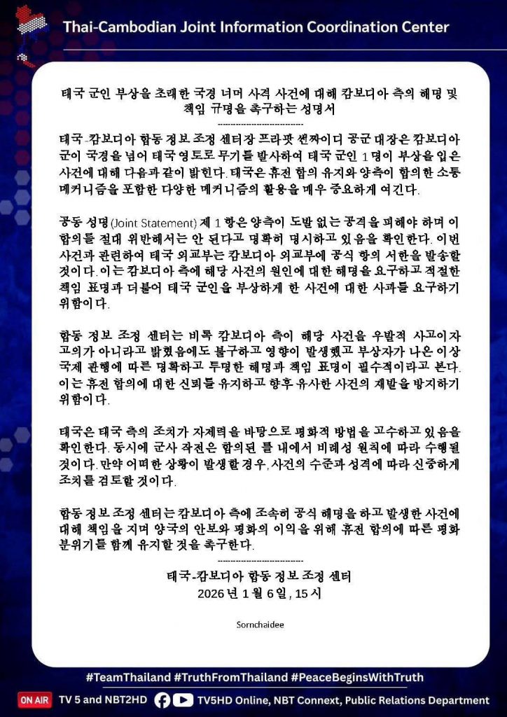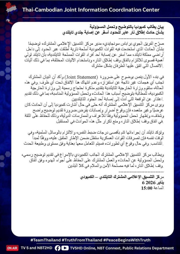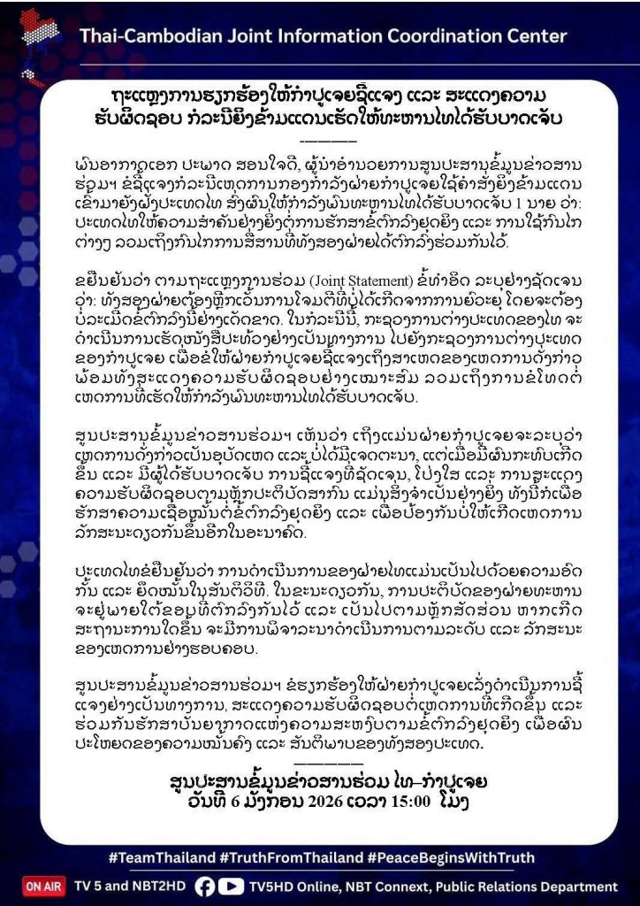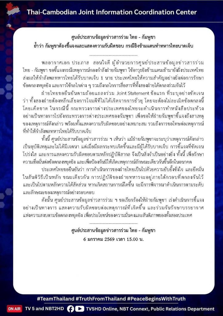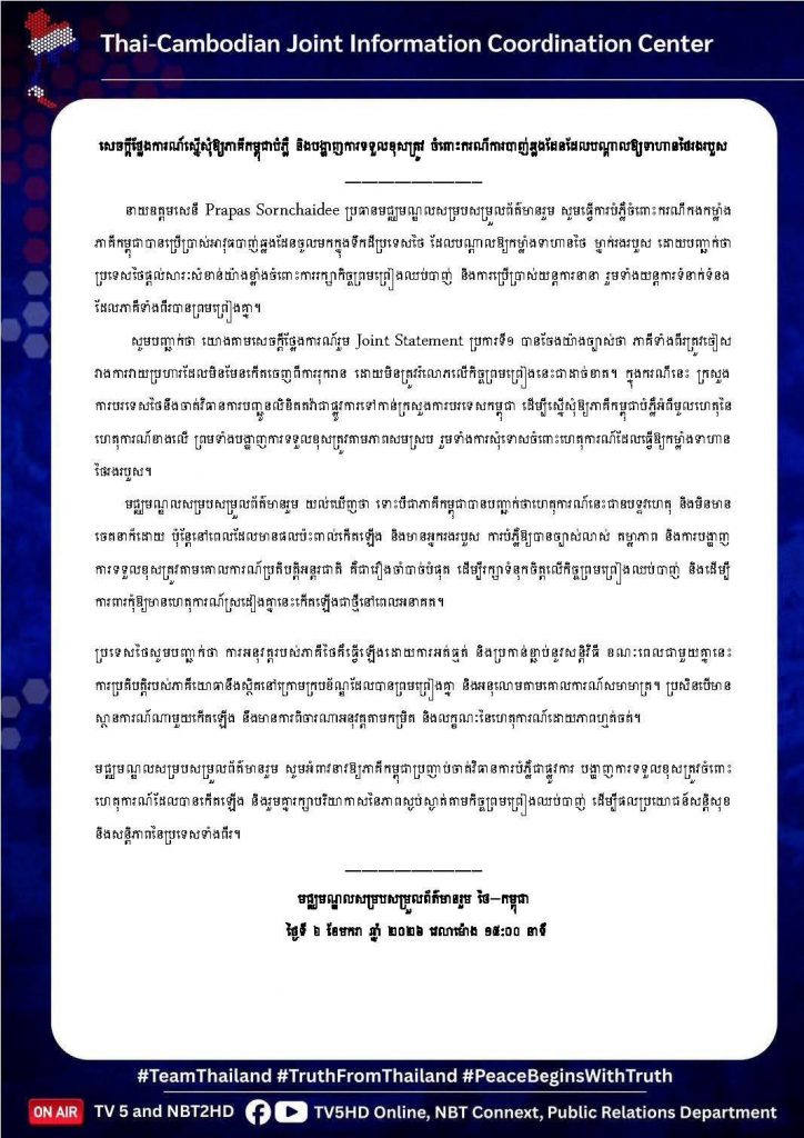 ดังนั้น ศูนย์ประสานข้อมูลข่าวสารร่วม ฯ ขอเรียกร้องให้ฝ่ายกัมพูชา เร่งดำเนินการชี้แจง อย่างเป็นทางการ แสดงความรับผิดชอบต่อเหตุการณ์ที่เกิดขึ้น และร่วมกันรักษาบรรยากาศแห่งความสงบตามข้อตกลงหยุดยิง เพื่อประโยชน์ของความมั่นคงและสันติภาพของทั้งสองประเทศ