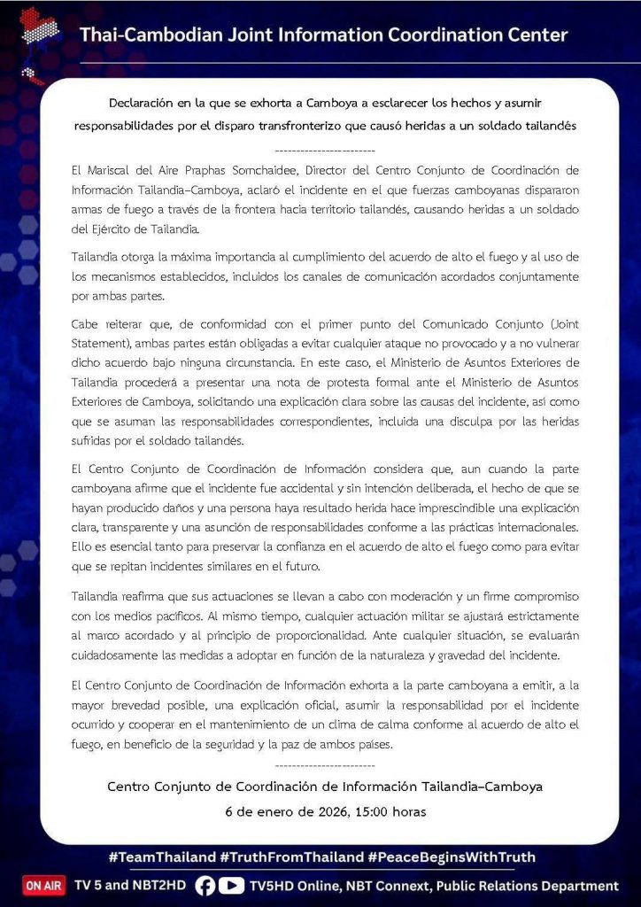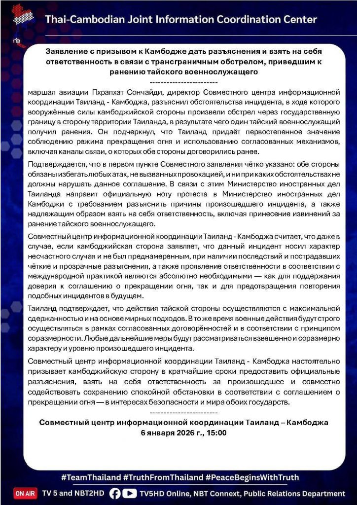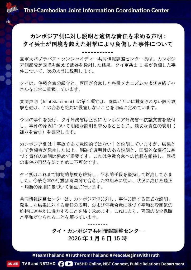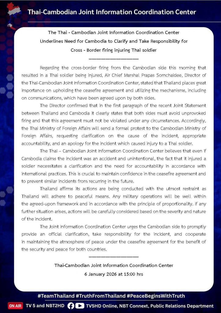 ทั้งนี้ ศูนย์ประสานข้อมูลข่าวสารร่วม ฯ เห็นว่า แม้ฝ่ายกัมพูชาจะระบุว่าเหตุการณ์ดังกล่าวเป็นอุบัติเหตุและไม่ได้มีเจตนา แต่เมื่อมีผลกระทบเกิดขึ้นและมีผู้ได้รับบาดเจ็บ การชี้แจงที่ชัดเจน โปร่งใส และการแสดงความรับผิดชอบตามหลักปฏิบัติสากล จึงเป็นสิ่งจำเป็นอย่างยิ่ง ทั้งนี้ เพื่อรักษาความเชื่อมั่นต่อข้อตกลงหยุดยิง และเพื่อป้องกันมิให้เกิดเหตุการณ์ลักษณะเดียวกันขึ้นอีกในอนาคต