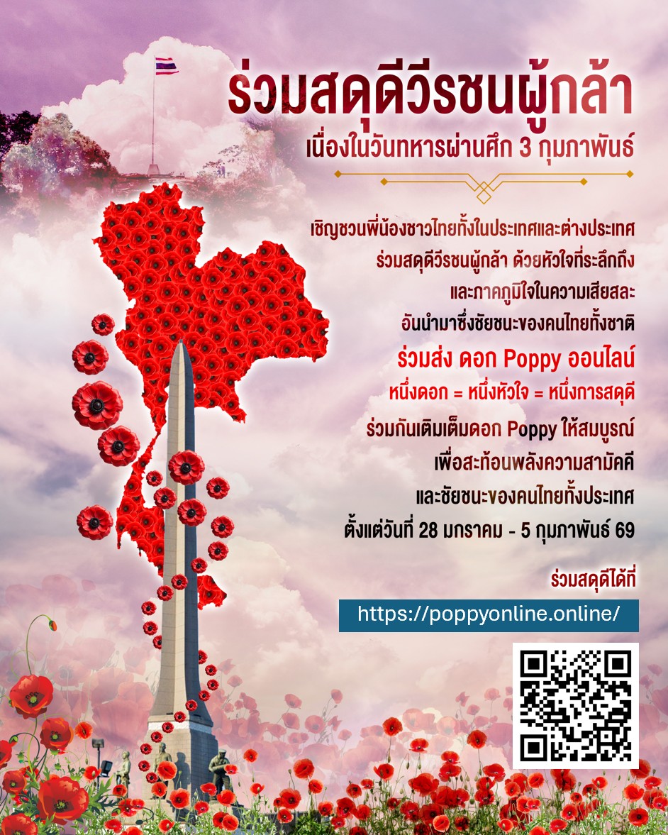 ร่วมกันเติมเต็มดอก Poppy ให้สมบูรณ์ เพื่อสะท้อนพลังความสามัคคีและชัยชนะของคนไทยทั้งประเทศ ตั้งแต่วันที่ 28 มกราคม – 5 กุมภาพันธ์ 69