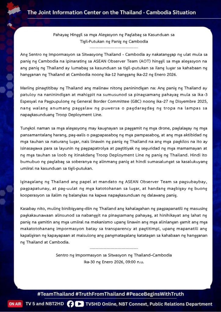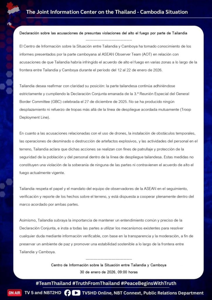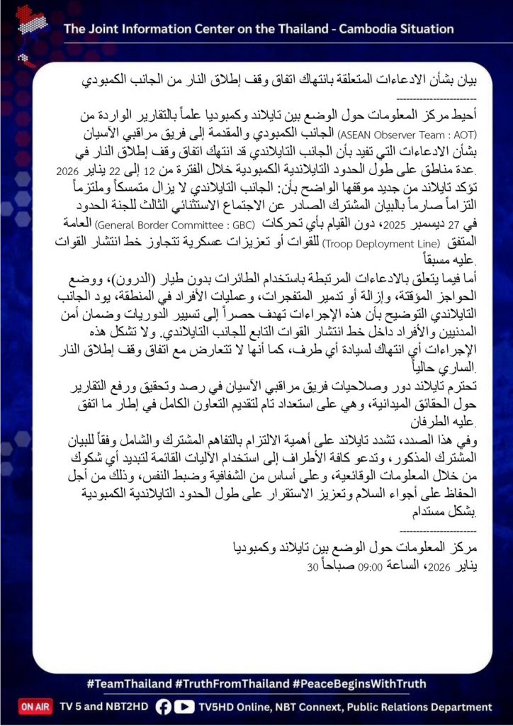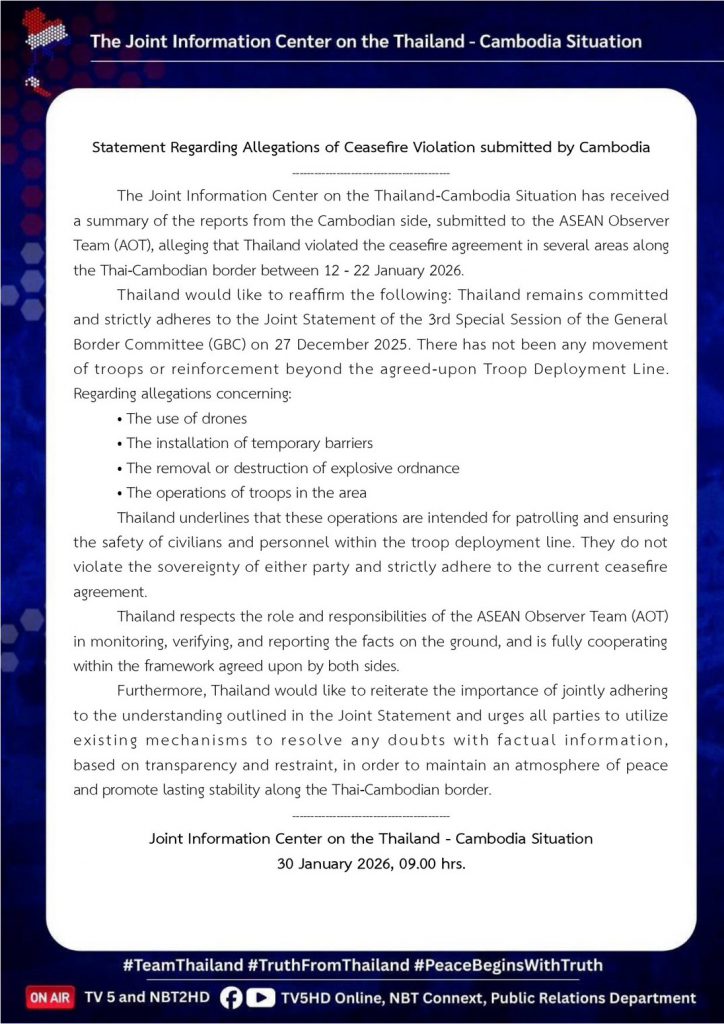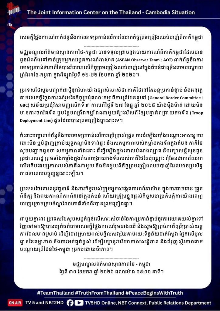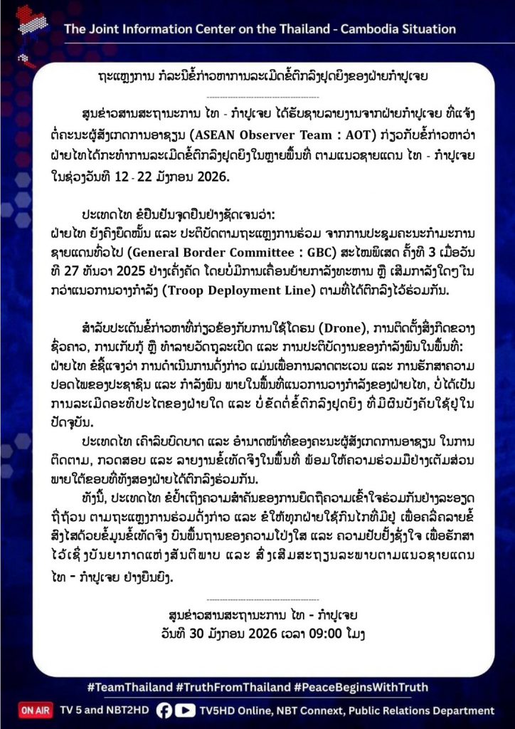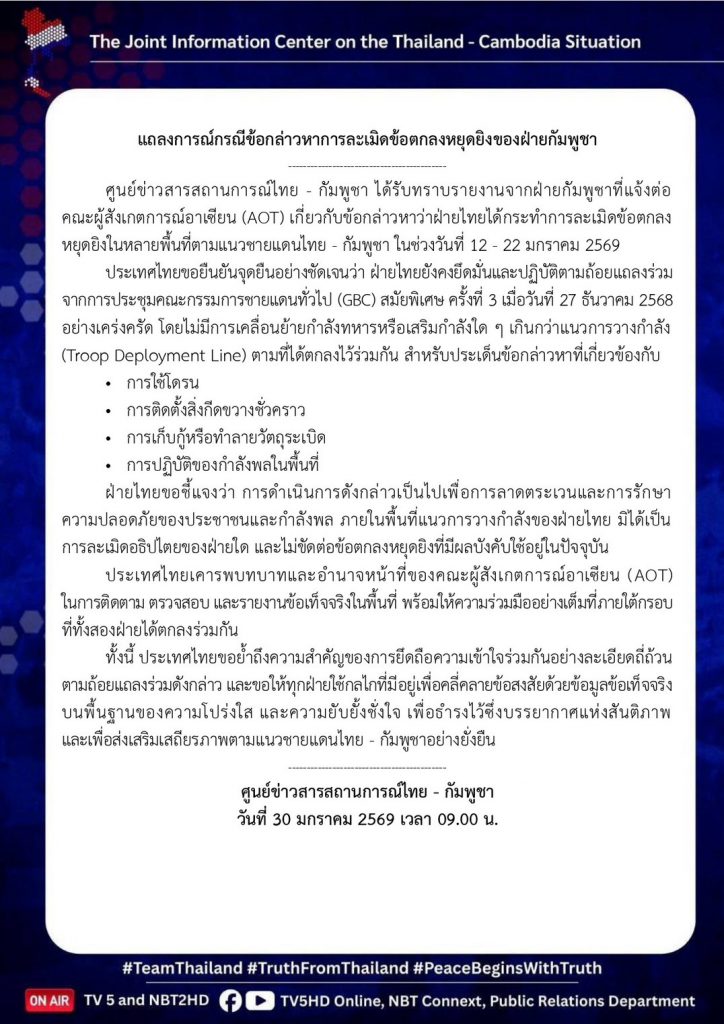 The Joint Information Center on the Thailand-Cambodia Situation has received a summary of the reports from the Cambodian side, submitted to the ASEAN Observer Team (AOT), alleging that Thailand violated the ceasefire agreement in several areas along the Thai-Cambodian border between 12 – 22 January 2026.