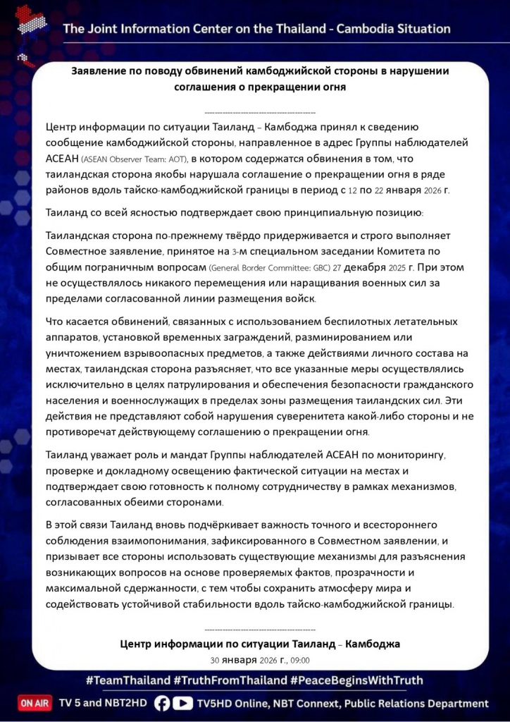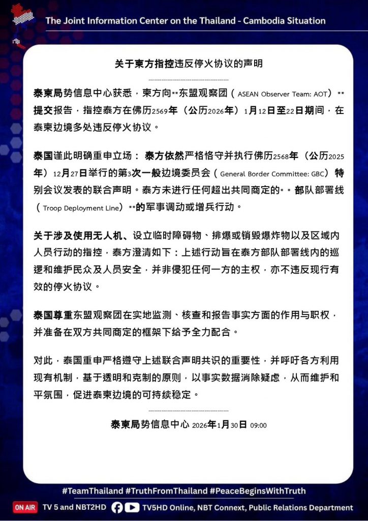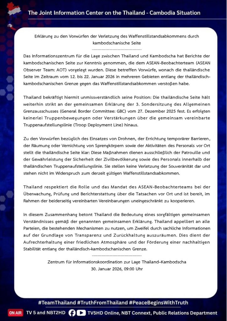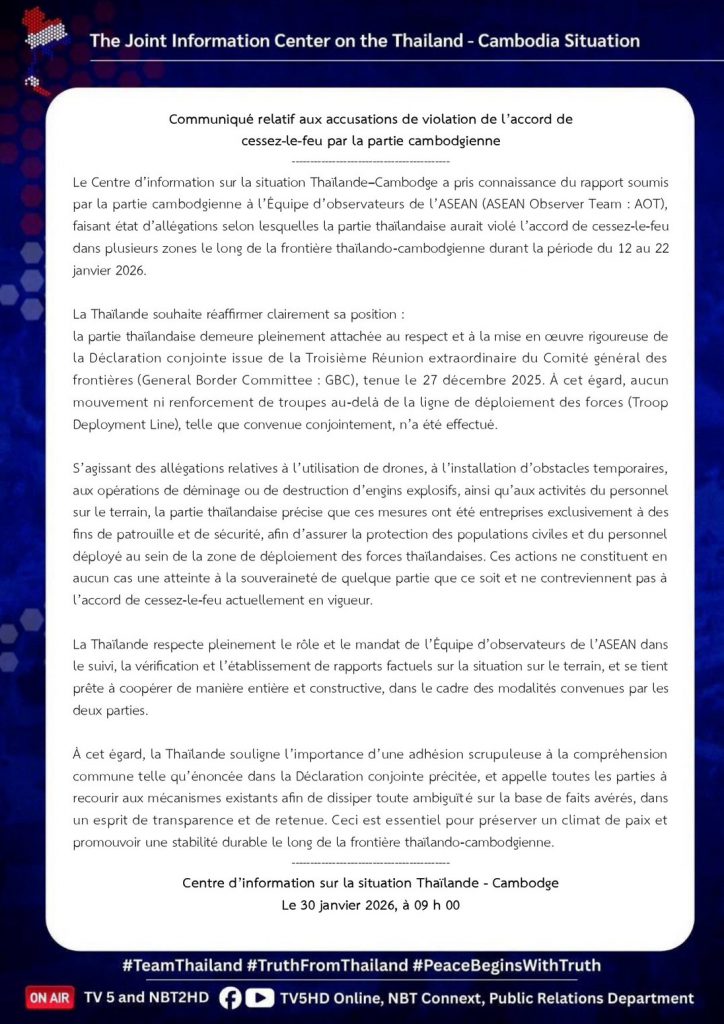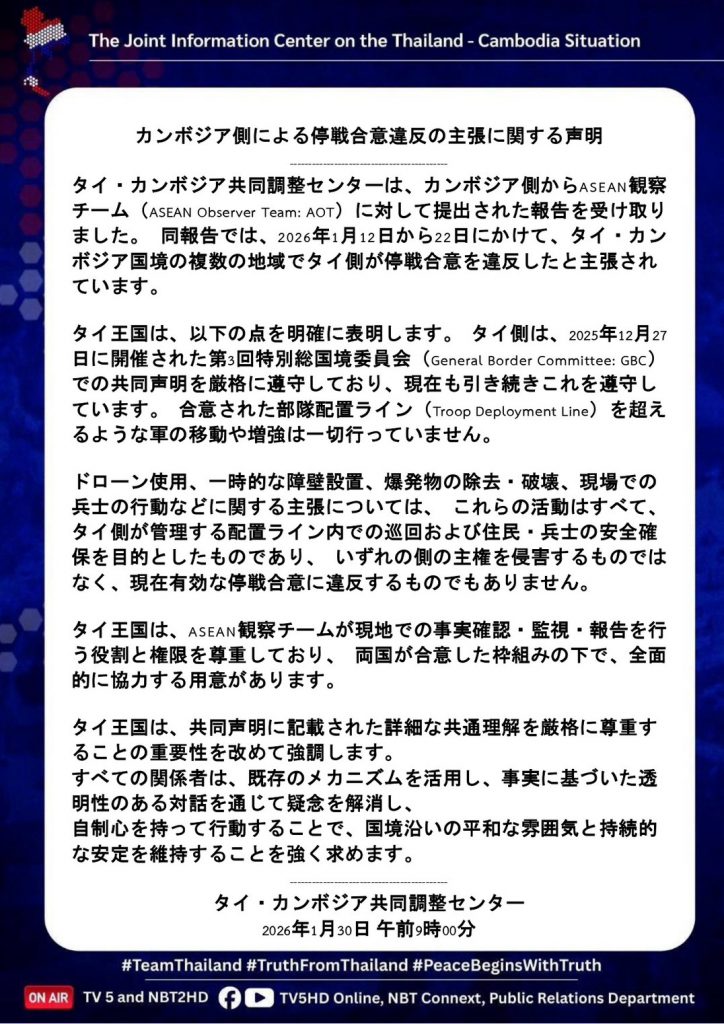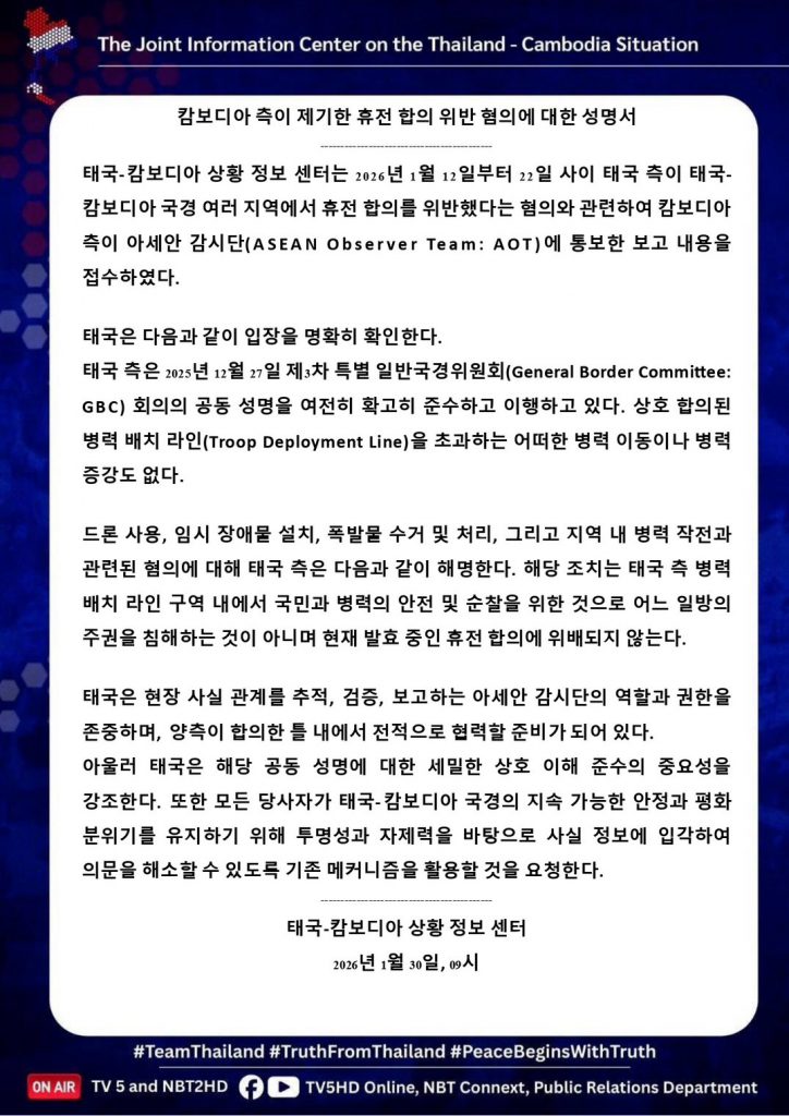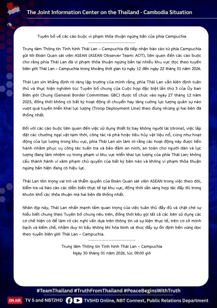 The Joint Information Center on the Thailand-Cambodia Situation has received a summary of the reports from the Cambodian side, submitted to the ASEAN Observer Team (AOT), alleging that Thailand violated the ceasefire agreement in several areas along the Thai-Cambodian border between 12 – 22 January 2026.