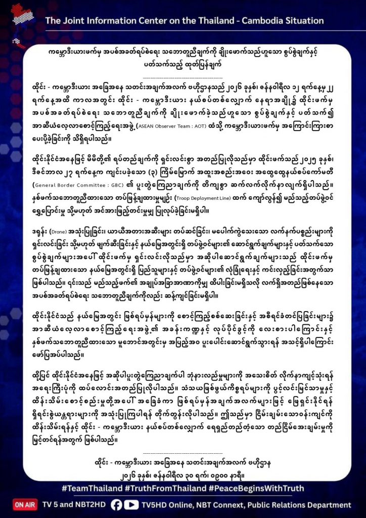 ทั้งนี้ ประเทศไทยขอย้ำถึงความสำคัญของการยึดถือความเข้าใจร่วมกันอย่างละเอียดถี่ถ้วนตามถ้อยแถลงร่วมดังกล่าว และขอให้ทุกฝ่ายใช้กลไกที่มีอยู่เพื่อคลี่คลายข้อสงสัยด้วยข้อมูลข้อเท็จจริง บนพื้นฐานของความโปร่งใส และความยับยั้งชั่งใจ เพื่อธำรงไว้ซึ่งบรรยากาศแห่งสันติภาพและเพื่อส่งเสริมเสถียรภาพตามแนวชายแดนไทย – กัมพูชาอย่างยั่งยืน