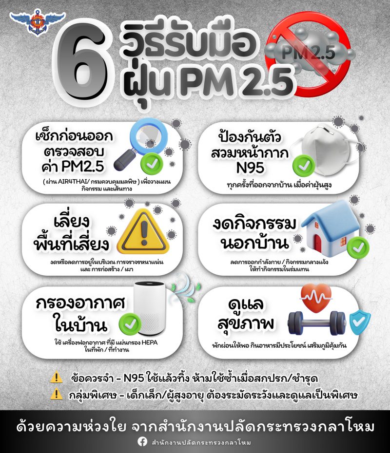06 ก.พ. 00 6 วิธีรับมือ ฝุ่น PM 2.5 6 กุมภาพันธ์ 2026หลักเมืองออนไลน์หลักเมืองสัมพันธ์ #กระทรวงกลาโหม #สำนักงานปลัดกระทรวงกลาโหม #กองทัพไทย #กองบัญชาการกองทัพไทย #กองทัพบก #กองทัพเรือ #กองทัพอากาศ