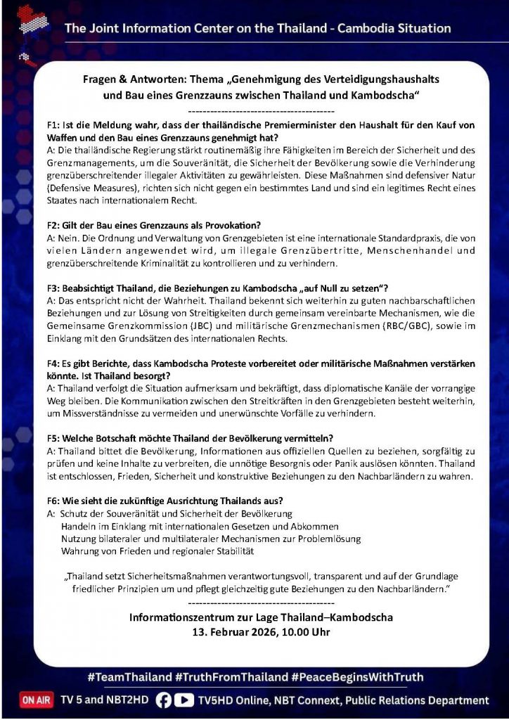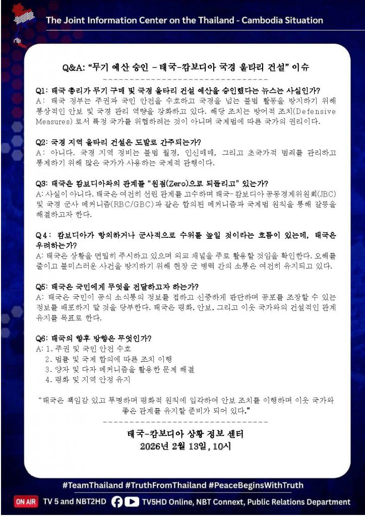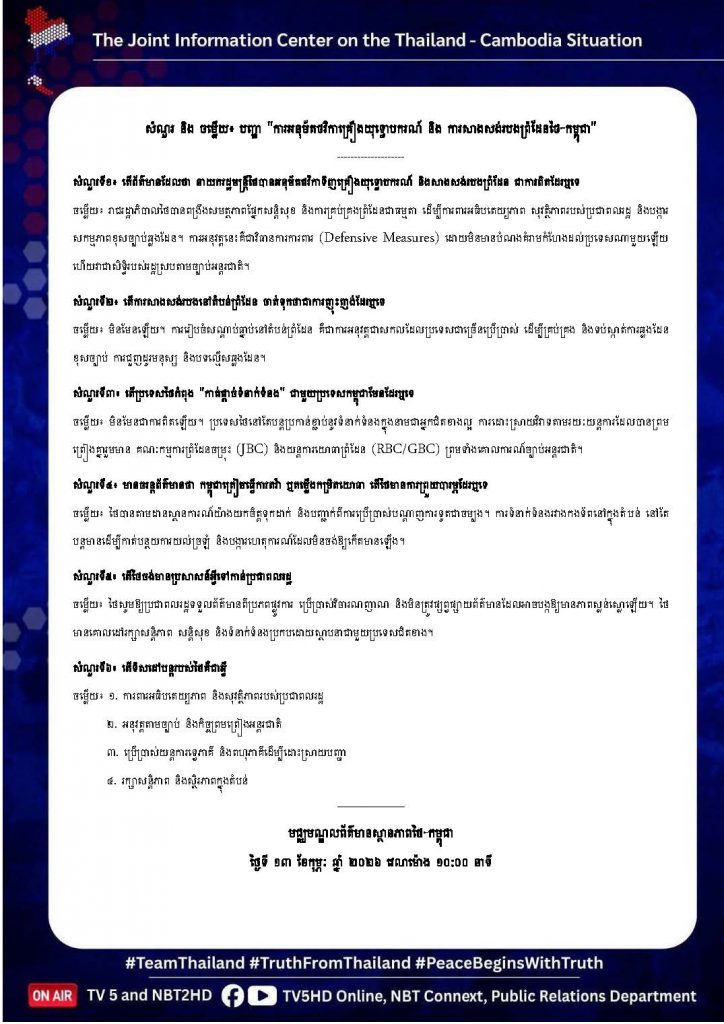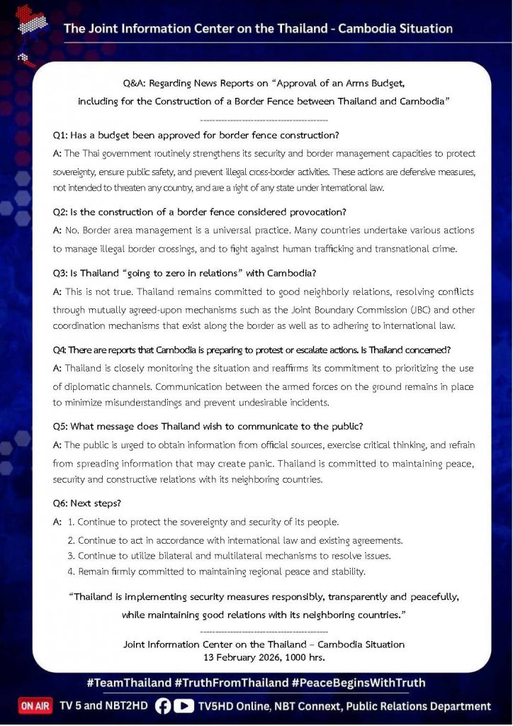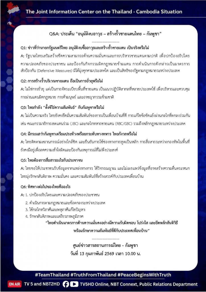 13 ก.พ. 00 Q&A : ประเด็น “อนุมัติงบอาวุธ – สร้างรั้วชายแดนไทย – กัมพูชา” 🇹🇭🇰🇭 13 กุมภาพันธ์ 2026หลักเมืองออนไลน์รักษ์ความสงบ