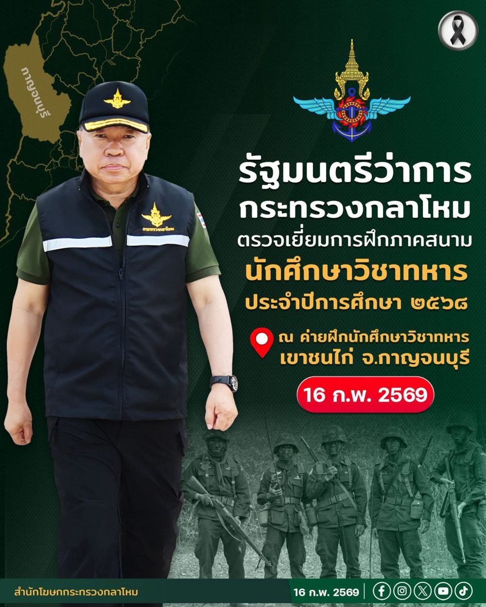 16 ก.พ. 00 รัฐมนตรีว่าการกระทรวงกลาโหม ตรวจเยี่ยมการฝึกภาคสนาม นักศึกษาวิชาทหาร ประจำปีการศึกษา ๒๕๖๘ 16 กุมภาพันธ์ 2026หลักเมืองออนไลน์หลักเมืองสัมพันธ์ ณ ค่ายฝึกนักศึกษาวิชาทหาร เขาชนไก่ จ.กาญจนบุรี วันที่ 16 ก.พ. 2569 #นักศึกษาวิชาทหาร #เขาชนไก่ #สำนักโฆษกกระทรวงกลาโหม