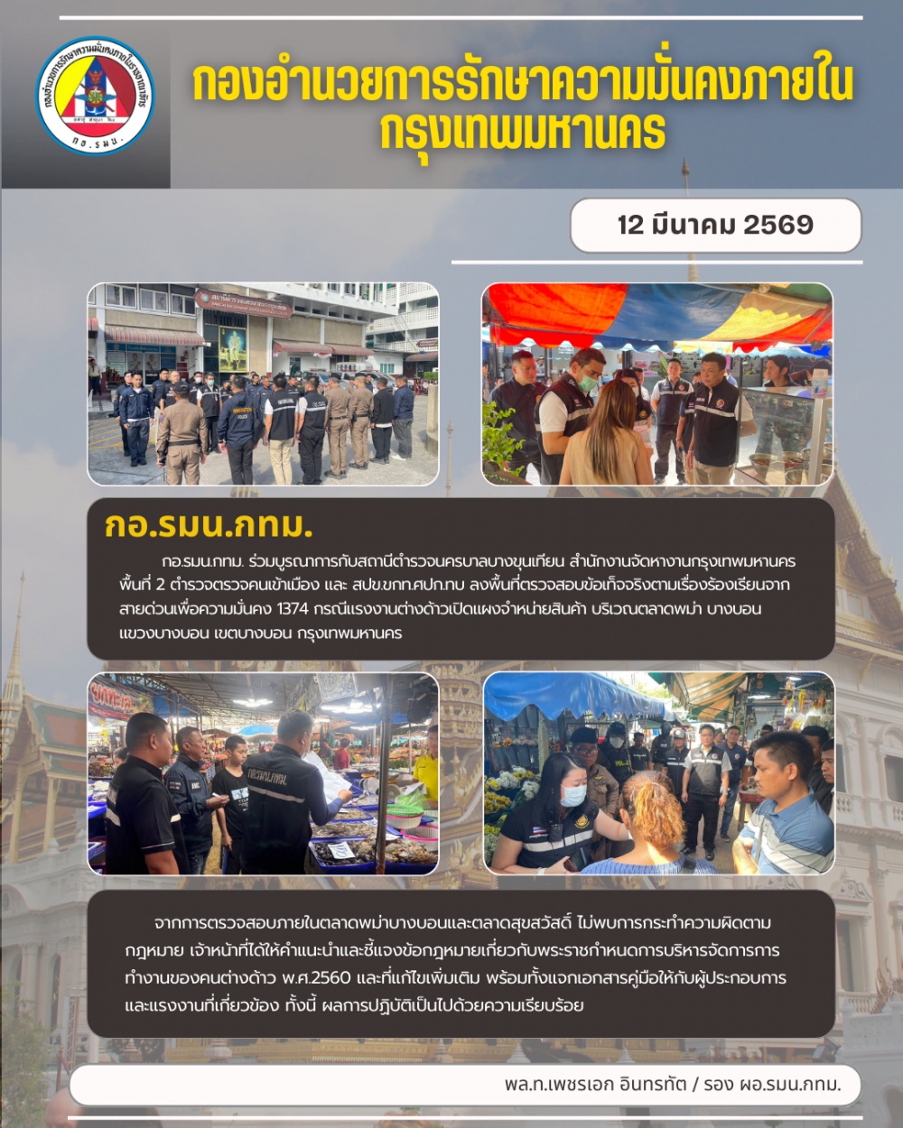 ลงพื้นที่ตรวจสอบข้อเท็จจริงตามเรื่องร้องเรียนจากสายด่วนเพื่อความมั่นคง 1374 กรณีแรงงานต่างด้าวเปิดแผงจำหน่ายสินค้า บริเวณตลาดพม่า บางบอน แขวงบางบอน เขตบางบอน กรุงเทพมหานคร