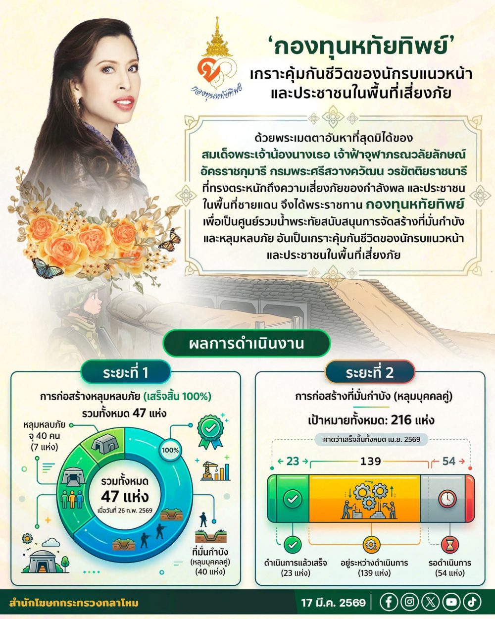 สนับสนุนการจัดสร้างที่มั่นกำบังและหลุมหลบภัย อันเป็นเกราะคุ้มกันชีวิตของนักรบแนวหน้าและประชาชนในพื้นที่เสี่ยงภัย…