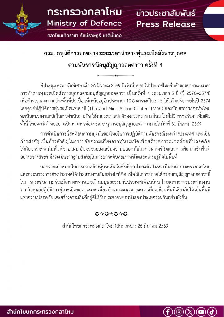 ที่ประชุม ครม. นัดพิเศษ เมื่อ 26 มีนาคม 2569 มีมติเห็นชอบให้ประเทศไทยยื่นคำขอขยายระยะเวลาการทำลายทุ่นระเบิดสังหารบุคคลตามอนุสัญญาออตตาวา เป็นครั้งที่ 4 ระยะเวลา 5 ปี (ปี 2570–2574) เพื่อสำรวจและกวาดล้างพื้นที่ปนเปื้อนที่เหลืออยู่อีกประมาณ 12.8 ตารางกิโลเมตร ให้แล้วเสร็จภายในปี 2574 โดยศูนย์ปฏิบัติการทุ่นระเบิดแห่งชาติ (Thailand Mine Action Center: TMAC) กองบัญชาการกองทัพไทย จะเป็นหน่วยงานหลักในการดำเนินภารกิจ ใช้งบประมาณปกติของกระทรวงกลาโหม โดยไม่มีการขอรับงบเพิ่มเติม ทั้งนี้ ไทยจะส่งคำขออย่างเป็นทางการต่อฝ่ายเลขานุการอนุสัญญาออตตาวาภายในวันที่ 31 มีนาคม 2569