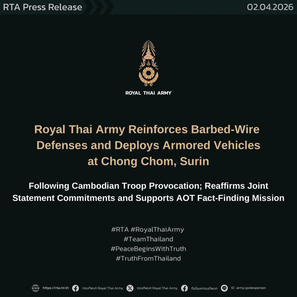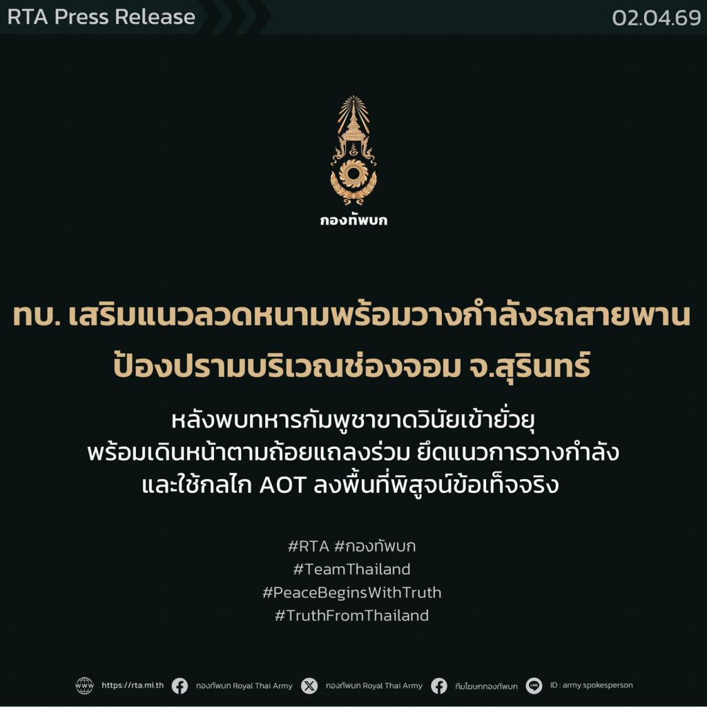 Royal Thai Army reaffirmed its readiness along the border, with forces positioned in Thai-controlled areas to closely monitor developments and respond appropriately to any situation. Citizens are urged to trust the Royal Thai Army’s mission and rely only on official Army and government communication channels for updates, to avoid misinformation that could cause misunderstanding or unnecessary alarm in society.
