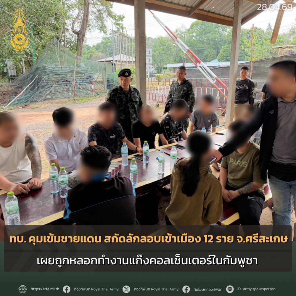 เมื่อ 27 เม.ย.69 กองทัพบก ได้รับรายงานจากกองทัพภาคที่ 2 โดยหน่วยเฉพาะกิจที่ 3 กองกำลังสุรนารี กรณีตรวจพบและสกัดจับกลุ่มบุคคลต้องสงสัยสัญชาติเวียดนาม ลักลอบเข้าเมืองโดยผิดกฎหมายผ่านช่องทางธรรมชาติ เข้ามายังประเทศไทยบริเวณชายแดนไทย-กัมพูชา ห่างจากจุดผ่านแดนช่องสะงำ อ.ภูสิงห์ จ.ศรีสะเกษ ประมาณ 380 เมตร รวม 12 คน (ชาย 10 คน และหญิง 2 คน) พร้อมของกลางโทรศัพท์มือถือ จำนวน 15 เครื่อง